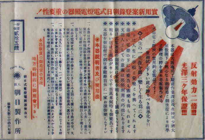 このような時こそ「明るいネタ」を提供し、世間様のお役に立つのが「兵器生活」の使命であります。と云うわけで、今回は「朝日式電燈電照器」のチラシをご紹介する次第です。