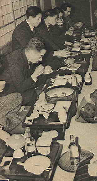 と例によって<善良な国民>の嫉妬心に訴える文章であるが、死ぬ前に一度くらい、キレイどころを並べた宴席の一つも持ちたいものである。実は内閣情報部(写真週報の発行部署)新年会でのスナップではないのか?