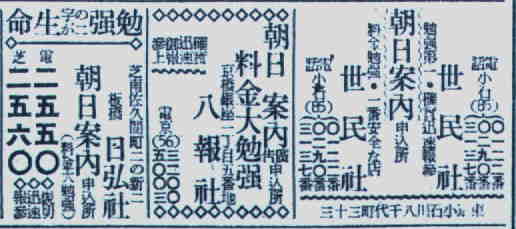 住所、電話番号が「プロユカタ」広告と同じ。察するに本業は、広告代理店のようだ。広告欄にキレイに代理店の広告が並んでいるのは、「紙面が埋まらなかった」と見て良い。他二社は十行だが、「世民社」は十五行も使っているから、それなりの実力を持った会社なのだと思う。