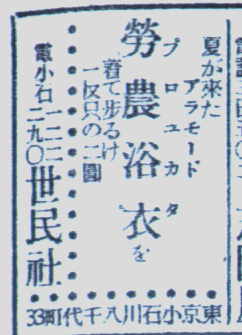 それと思い合いされるのが(註:前項『赤色スポーツ』を受けている)、近頃の新聞に出ている小さな広告。全文を転載すると「夏が来た。アラモード。労農浴衣(特にプロユカタと振仮名がつけてある)を着て歩け。一反、只の、二円」というのだが、どうです。
