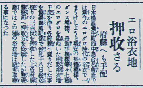 「プロユカタ」ならぬ「エロユカタ」が押収されたと云うもの。『裸体模様』はともかく、『ダンス模様』『舟遊び模様』のどのへんが「風俗壊乱」になるものか、これも気になるところだ。