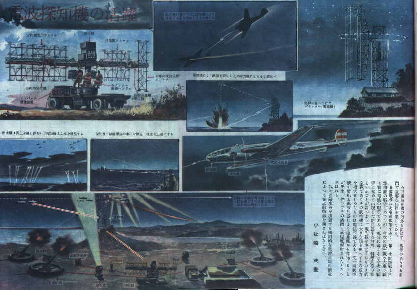 「機械化」ネタで、図版が八木アンテナだけ、と云うのは、総督府としても心苦しい。そこで折込口絵「電波探知機の活躍」をご覧いただこう。描くのは小松崎 茂だっ!