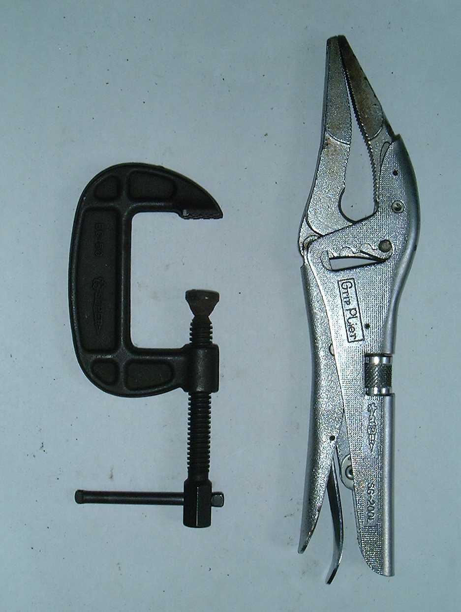 クランプともいいます。2つの材料を固定して接着したり、溶接したりするのに重宝です。複数個用意して仮止めしたり、位置を合わせたりするのに使用します。(写真左側)