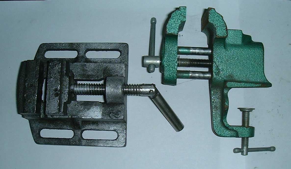 写真1のように頑丈な作業台にしっかりと固定された万力を思い浮かべる方も多いと思います。この万力を丸胴万力といいます。その他に、写真2右側をベンチバイス、写真2左側はボール盤用バイスといいます。ボール盤の台座の上に載られるように底面が平らにできています。ベンチバイスはドリルで穴を開ける材料を固定したりする時に使用します。ベンチバイスは下側のハンドルを締めつけて作業台に固定して使う小型のバイスです。