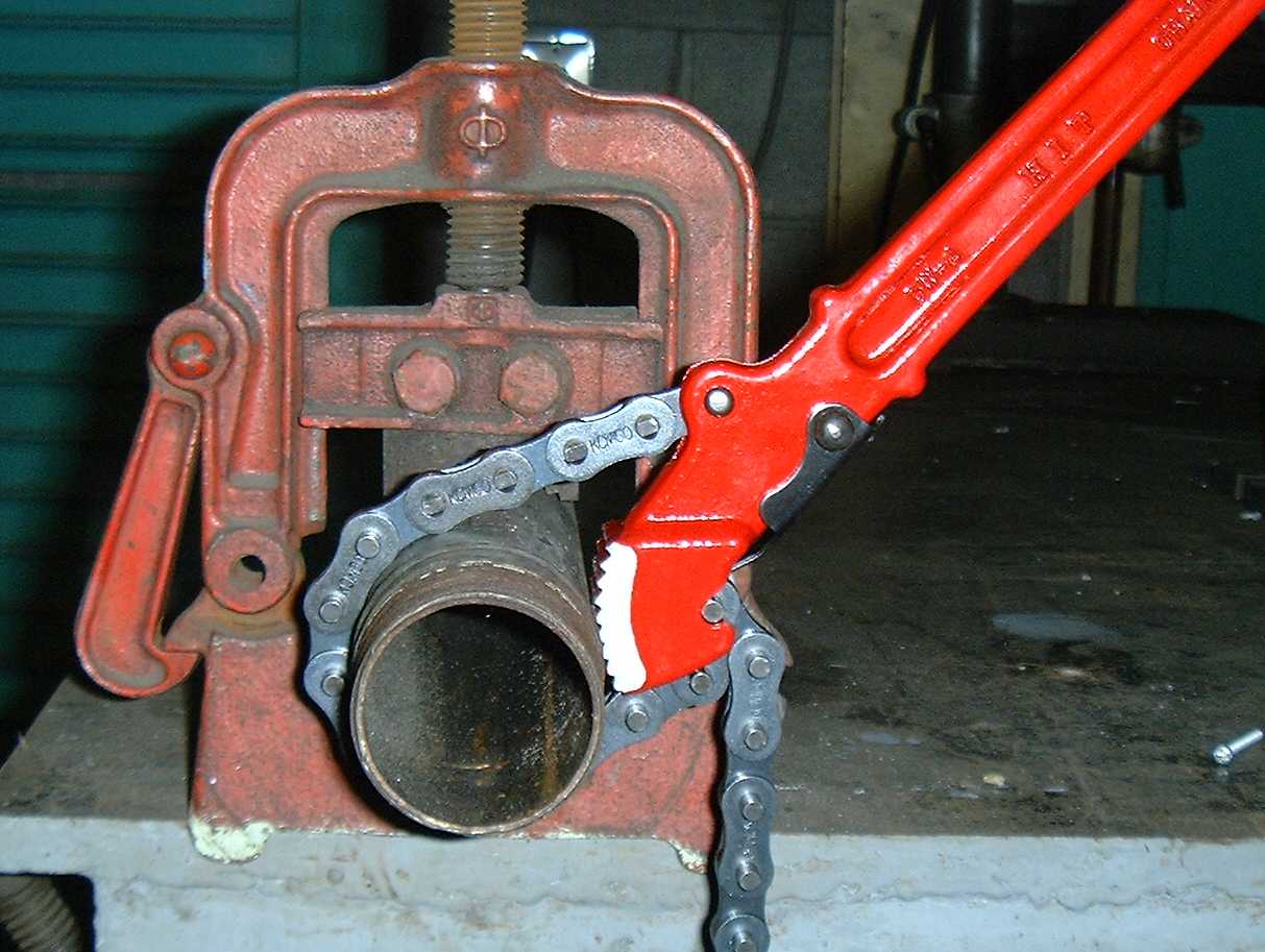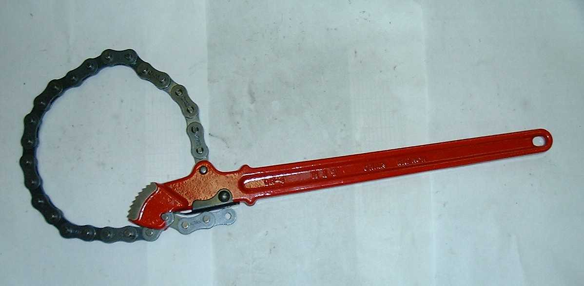 パイプレンチにはパイプをくわえる口の長さが短いために太いパイプになるとそれに対応したパイプレンチでなければくわえて力を加えられません。ですからパイプの径に対して十分に大きいパイプレンチということになってしまいます。その欠点をみごとに解決したのがチェーンレンチです。チェーン全体でパイプを締めつけるようにして力が加わるからパイプにもあまり傷がつきません。