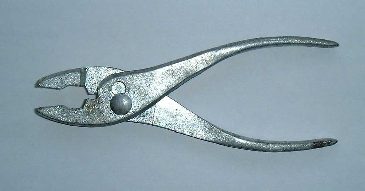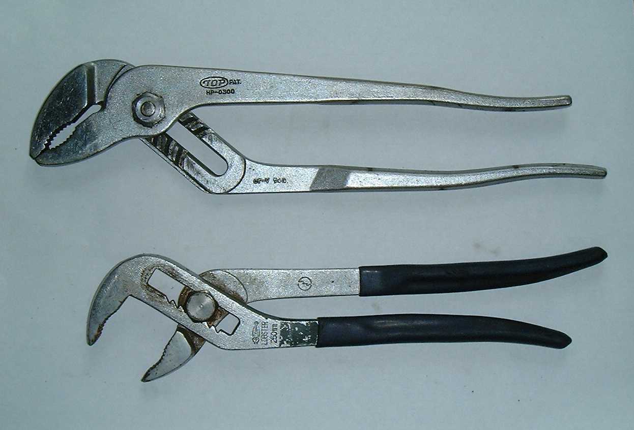 水道設備工事屋さんは必ず1本持っている(?)といわれる工具です。別名「烏口」といいます。名前は、その大きく開く烏のくちばしにも似た先端をみれば納得できます。プライヤに比べて支点を5ヶ所ほどスライドさせることが可能です。それによって水道管をもくわえて回すことができることから「ウォーターポンププライヤ」と言われています。先端は約60°斜めに傾けてあるので力を加えやすくなっています。まっすぐ引っ張るという使い方以外は先述のコンビネーションプライヤよりも用途は広いでしょう。サイズは250mmと300mmの2種類があります。特別大きな物をくわえるという用途がなければ250mmの方が使い勝手が良いでしょう。