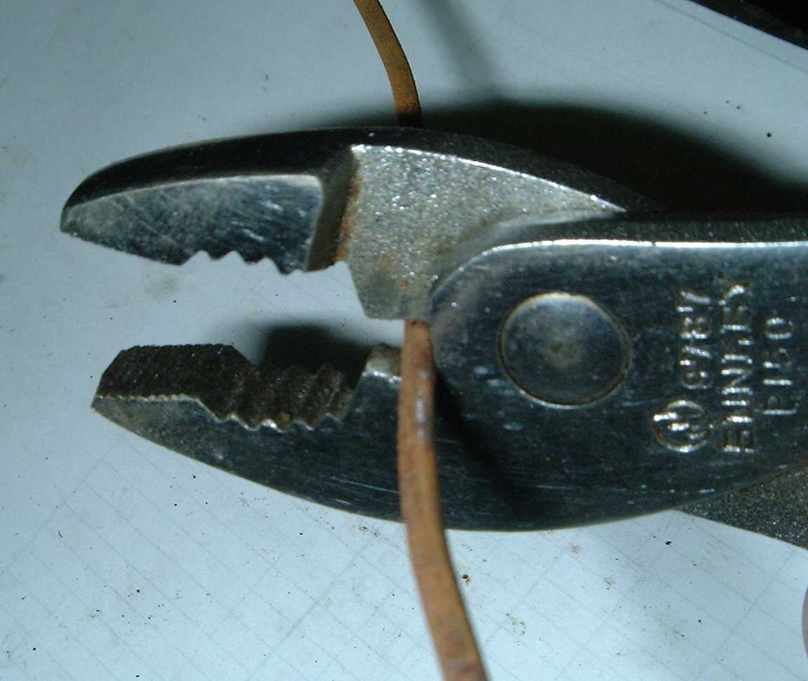 最も良く見かけるタイプで、単にプライヤといえばコンビネーションプライヤの事だと思ってください。先端で物を挟んで引っ張ることができ、ギザギザ部分でナットをくわえて回すことができます。アール部ではちょっとしたパイプなどをくわえることが可能です。ワイヤーカッター部では写真下のようにあごの根元で針金を切断することもできます。