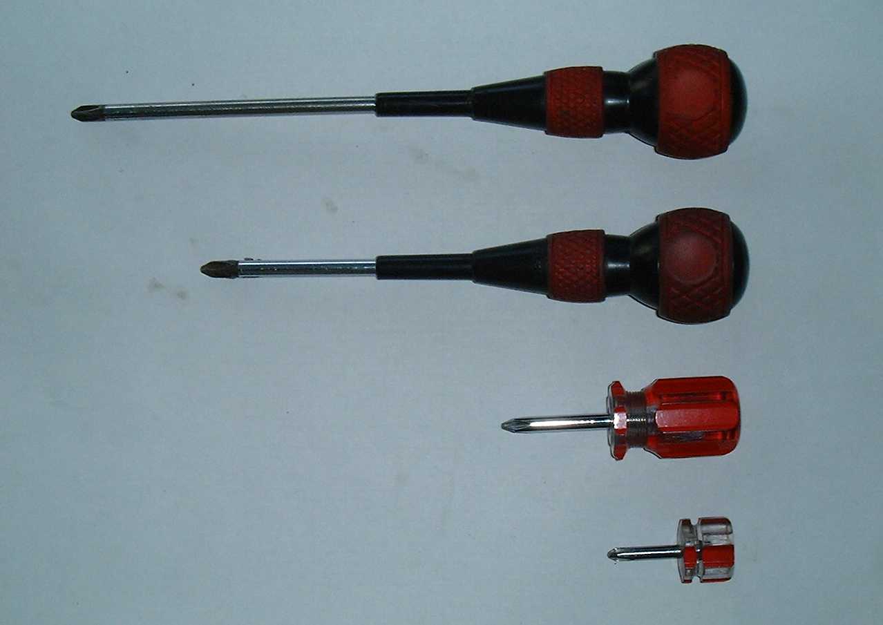 また、ドライバー全体の長さも考慮しなければいけません。奥に差し込んでネジを締め付ける場合は握りから先端までが長い写真の1番上のようなドライバーが必要です。しかし逆にネジの後ろに障害物があるような場合は、写真下2つに示すスタビードライバーという全長の短いドライバーが必要になります。スタビードライバーはNo2のサイズです。覚えておいて損はありません。