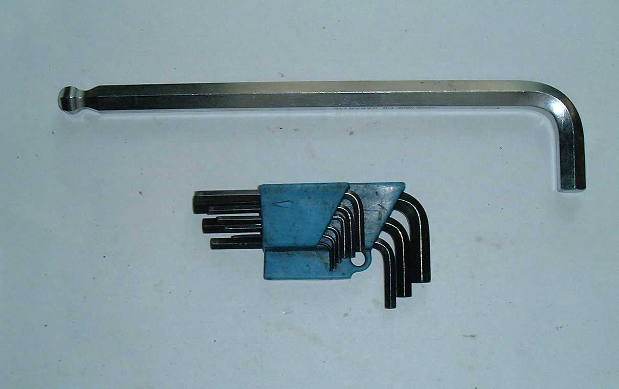 写真上側のように、6角レンチの柄が長いロングタイプで、さらに柄の先端を球状に加工したものを特にロングボールレンチと呼びます。ボールレンチはボルトの頭に対して垂直でなくてもボルトを回すことが出来ます。ただあまり大きな力を加えるような場合はさけてください。