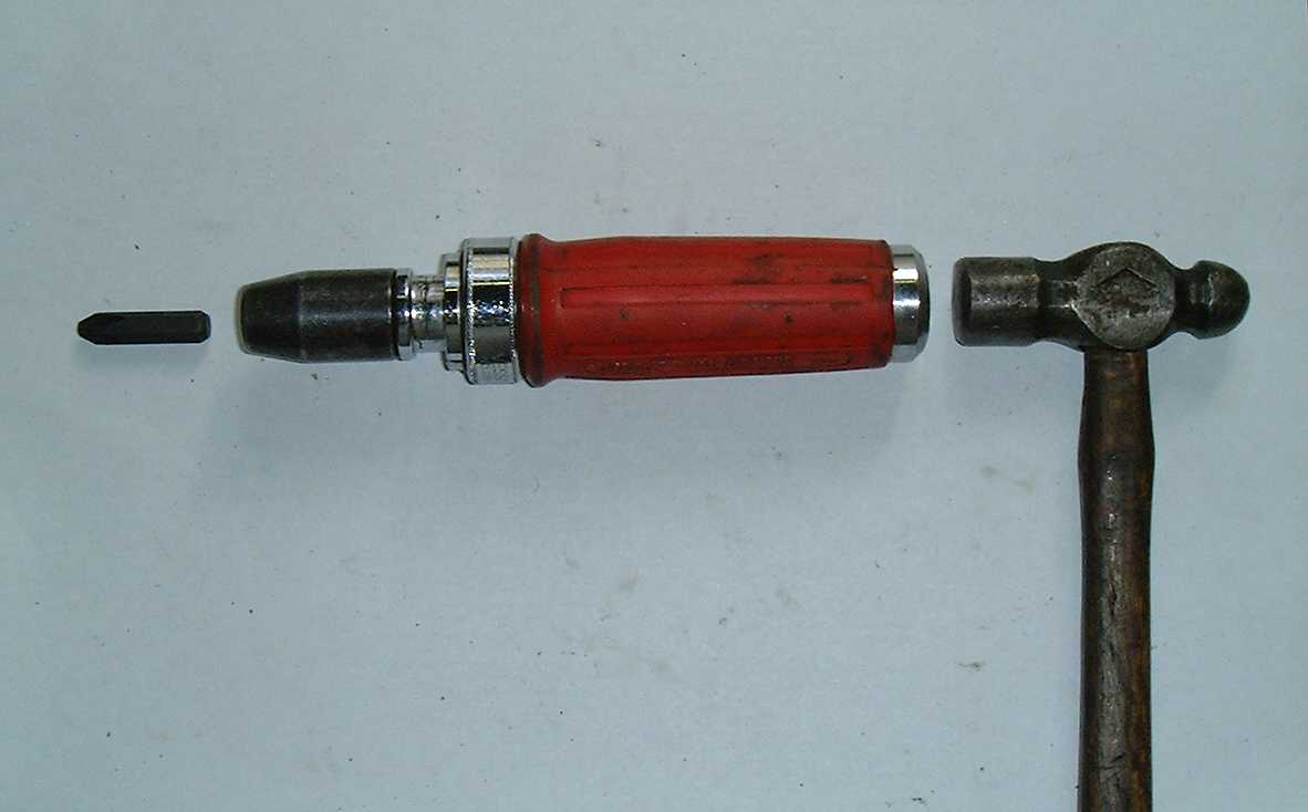 そういった問題をある程度考えて作られたのがインパクトドライバーです。ドライバーの後ろをハンマーでたたくとドライバーのビットが回転します。ドライバーの柄の先端に回転方向を選択するリングが付いています。このリングの位置L(左回転)に合わせてハンマーでドライバーの後ろをたたくとドライバー先端のビットはネジを緩める方向に回転します。またリングの位置をR(右回転)に合わせると締めつける方向にビットが回転します。