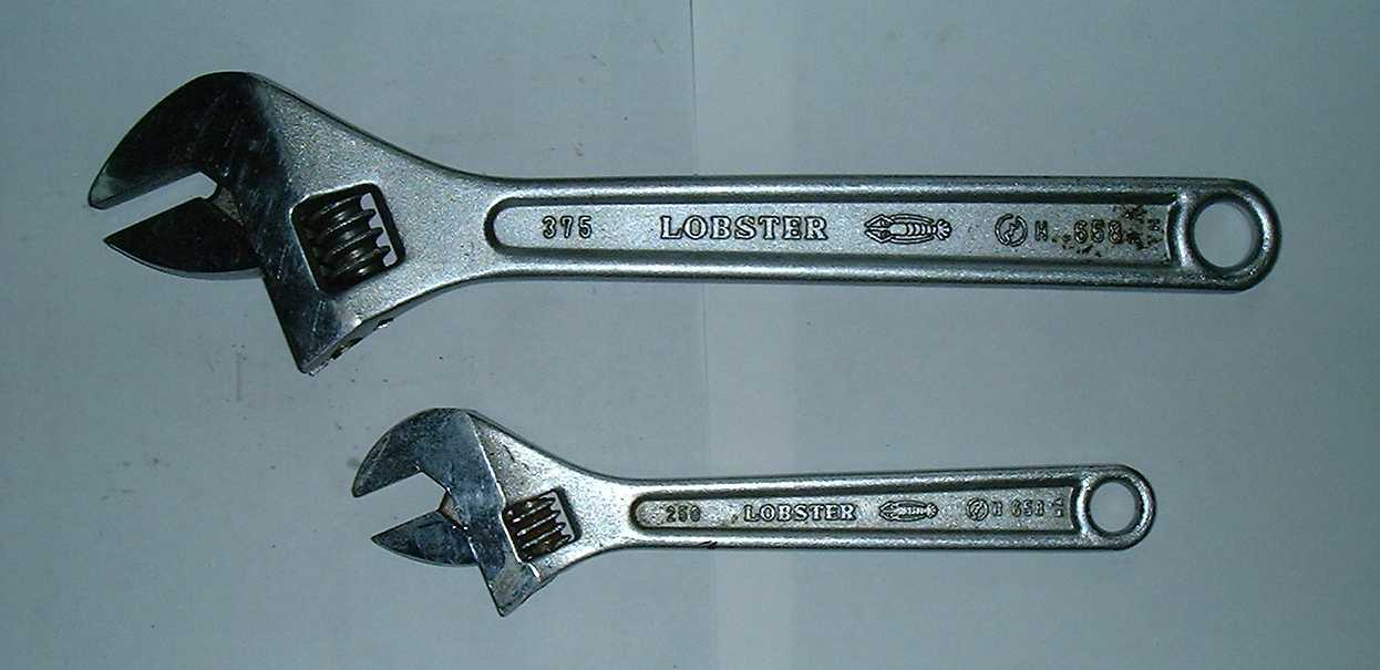 スパナの口の片側がスライドして色々なサイズのナットをまわすことができるように工夫されたレンチ