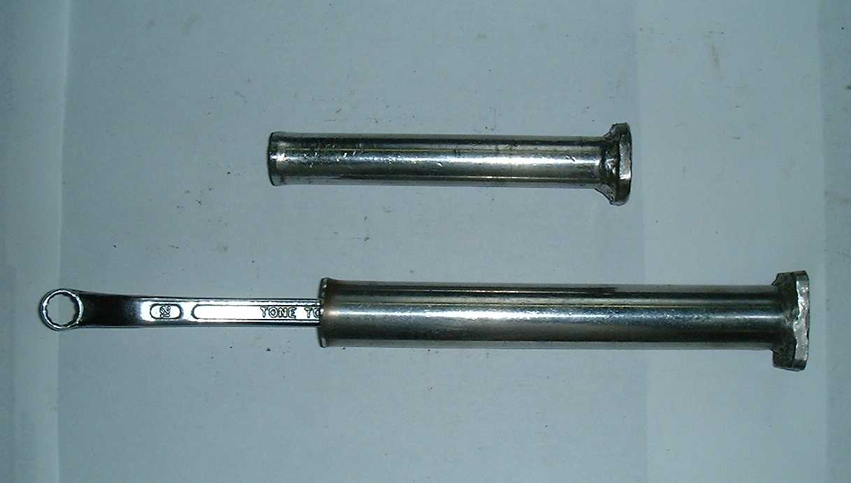 写真は丸パイプに平板を溶接したものです。写真のようにメガネレンチや6角ボールレンチに差し込んで大きな力を得ることもできます。先述しましたが、自己責任で作業してください。工具を壊す原因になります。