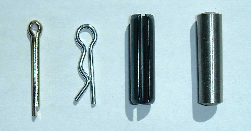 写真左端が割りピンと呼ばれるものです。サイズは5mm間隔であるようです。使用目的はスナップリングの軸用とほとんど同じです。割ピンを使用する場所にはシャフトにピンを通す穴が開けられています。その穴に割りピンの両足を指し込み穴に貫通させ、穴から出たところでペンチやプライヤで折り曲げて抜けないようにします。