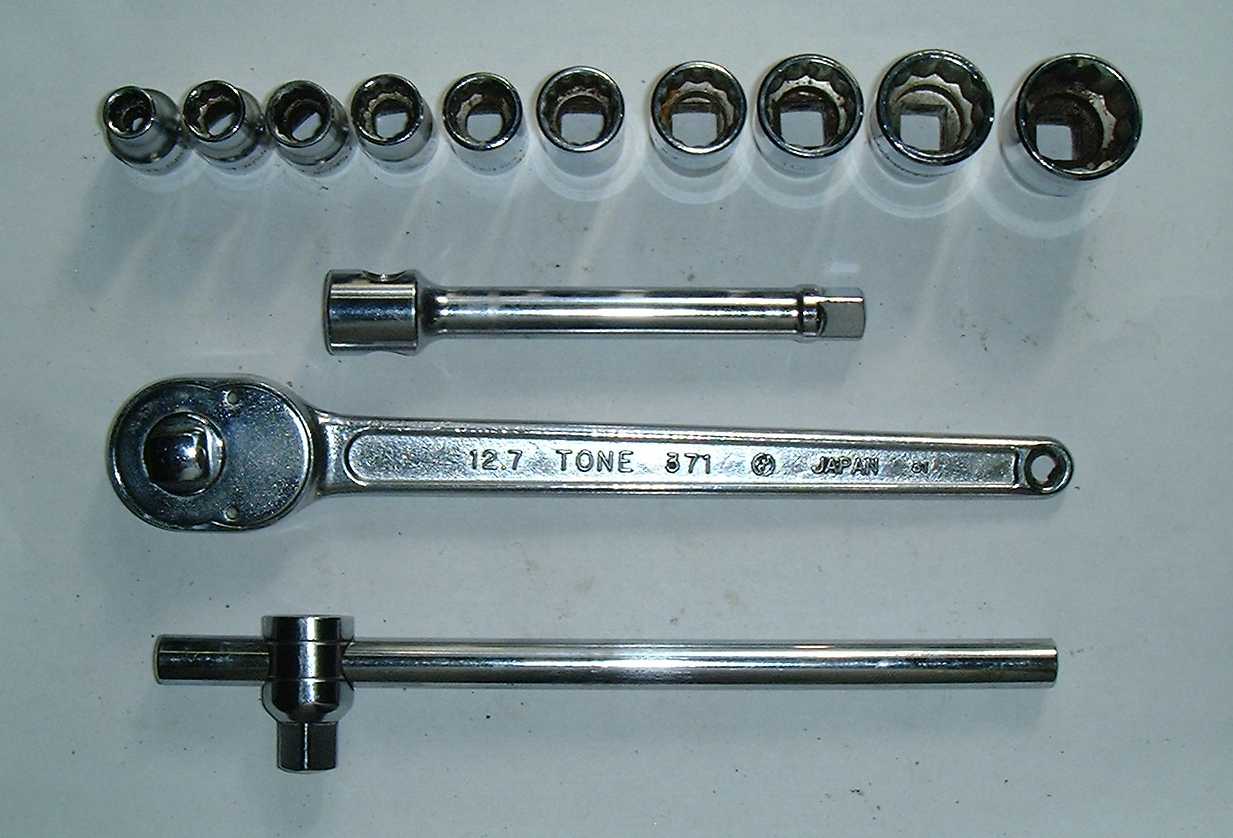 写真1はソケットレンチのセットです。中央のハンドルにソケットを取り付けて使用します。中央のハンドルを特にラチェットハンドルといいます。ハンドルの上のシャフトをエクステンションバーといい、深いところのナットを回すのにラチェットハンドルとソケットの間に取りつけて使用します。