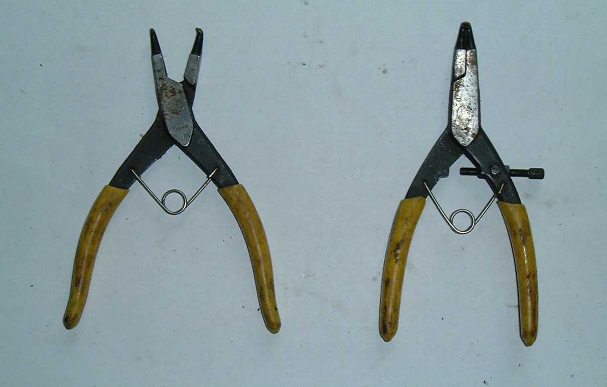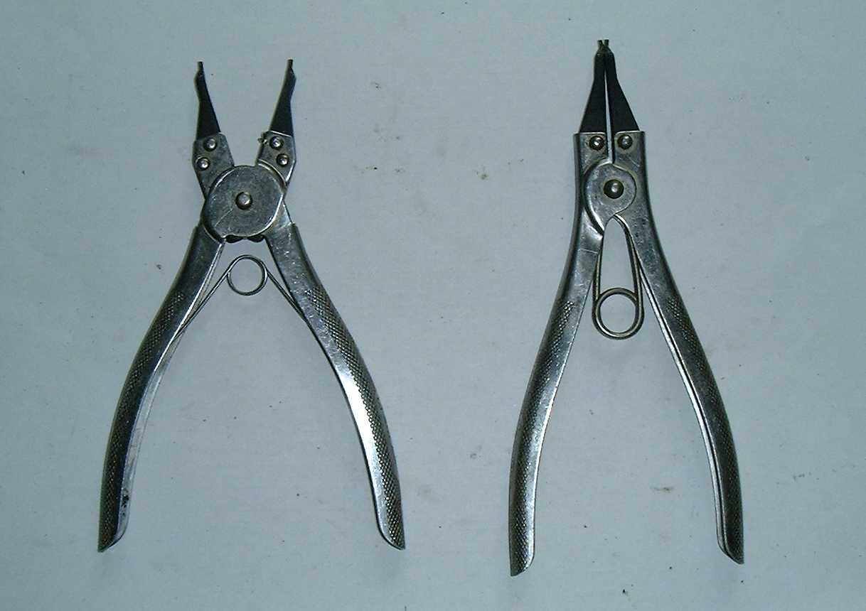 ベアリングやシャフトがスライドしない様にスナップリングで固定する方法があります。このスナップリングをはさむ工具がスナップリングプライヤです。スナップリングプライヤは握ると先端が閉じるものと開くものがあります。また写真上のように先端がまっすぐなものと写真下のように90度曲げられているものがあります。
