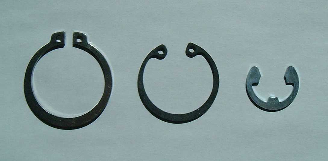 写真右側は軸に使用するEリングという止め金具です。軸用のスナップリングと使用目的は同じです。形がアルファベットのEに似ていることから名前が付いています。スナップリングの用にプライヤ用の穴がありません。その分径の小さいシャフトに限定されるようです。呼び径で0.8mmから24mm程度までのサイズです。ただしステンレス製のEリングのサイズは19mm程度までです。これはバネ鋼でないため強度が不足するためと思われます。