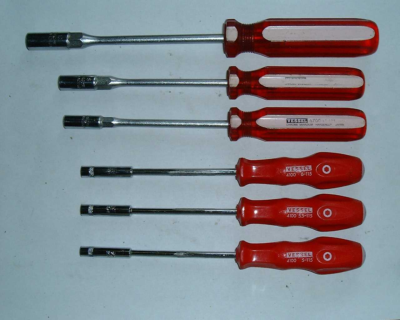 形状はドライバですが、先端はナットを緩めることができるようにソケット(ボックス)レンチになっています。大きなナットを緩めるためではありませんので、6〜12mm程度のソケットが用意されています。