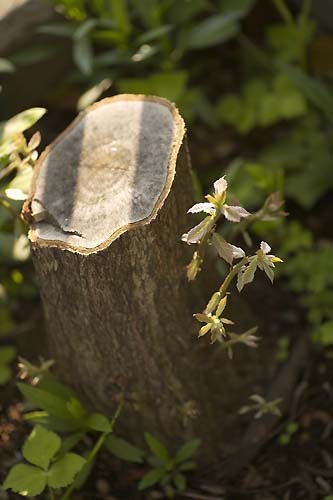 中央が切り株で放射状に脇芽が勢いよく伸びている。