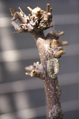 実はこの卵(卵のう)は、ハラビロカマキリのお母さんが生んだものなんです。昨年の秋、鉢の側をウロウロ