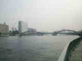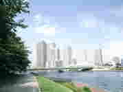 聖路加ガーデンタワーの裏はもう隅田川。川沿いに遊歩道「隅田川テラス」が作られていて、人々が思い思いに川を眺めている姿が見られる。左の写真はテラスから佃島方向を撮った。手前の橋が佃大橋、その向こうにそびえる高層マンションは「リバティー21」 |