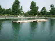 公園の西側にイベント池があります。毎年10月ここで伝統の角乗りが行われるそうです。この角乗りは、水に浮かべた材木を鳶口で乗りこなし、筏に組む仕事をする川並と呼ばれる人々の余技から生まれた伝統芸能です。もうひとつの伝統、木場の木遣りは、もともとは労働歌だったと言われています。材木業者たちが、材木を操る時に呼吸を合わせるために、即興の詞をつけて歌われました。 |