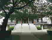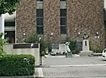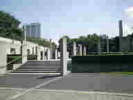 | 外壁両サイドの花崗岩パネルのグレーと、ガラスのカーテンウォールが対照的。まんなかにあるには「鎮魂」の碑。水のカーテンは一服の清涼剤でした。 | この何も無い空間に心が癒される。 | 霊苑から見えるのが、文京シビックセンターです。私たちはこのあとセンターの展望室に登り、東京のパノラマを満喫しました。 | おまけ。 センターの後ろにある、柔道の殿堂講道館。加納治五郎の銅像です。時間の都合で今回は回れませんでした。 |