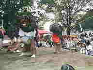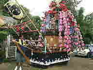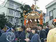 | 「氷川神社」の秋祭り。10/6に撮影したものです。 | 花を飾った山車。 | 中野区の無形民俗文化財の「江古田獅子舞」 | お神輿を担ぐ女性が輝いていましたね。 |