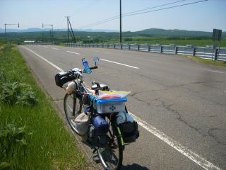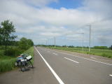 両側とも広大な畑か牧場、日曜日のせいか車の行き来も少なく、これが北海道の道だぞ、とご機嫌サイクリング。こんな条件なら1日200qでもいけそうだ。こちらへのルート変更は大成功だと一人ほくそえむ。何事も結果が大事なのだ。