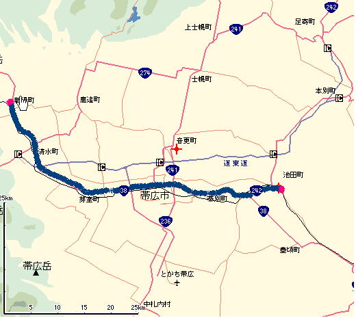 R242で南へ下り幕別でR38に入り、西に方向を変えてJRの跨線橋を越えたところ。