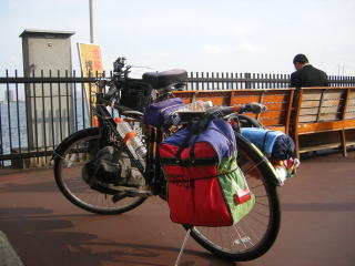 食後、先ほど遅れて最後に乗船した客と話し 込む。年齢は70歳位で川口から自走で来た のだが晴海と間違えてしまったとか。自転車 のキャリアは5〜6年のベテランで、テント生活 をしながら九州の南半分を回るのだそうだ。 もう一人元神奈川県警の警官でSWAT訓練を 受けた事のある若者とも知合いになる。 |