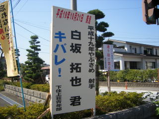 | 6:00 起床。 7:00 ホテルの朝食をしっかり食べて 8:10 出発。 天気は良いし、いつもながら朝一番の走りは気持ちが良い。 ものの7qほど行くとR220と R448の分岐点に出る。海側のR448に進み南下する。 実は、ここから10qほど行くと肝属川(きもつきがわ)の河口に出て、事前の調査によると、 そこから「肝属川河畔自転車道」が川を遡るような感じでできているようなので、国道・県道を はずれ、そこを走ることに決めていた。 9:10 肝属川河口に出たのだが、その入り口が見つからない。土地のおじさんに聞いてみても 埒があかない。エエイッという感じでとにかく川に沿って(それはどう見ても一般道)走ってみるが 一向にそれらしき道が見えてこない。 3〜4qほど走ったが諦めて南西方向に走る道があったので、そちらへコースをとる事にした。 この道は県道R520だった。 3q程走ると西に向かう広い県道R73とぶつかる新富の町に出た。 ここで右上の写真の 立看板を見つけた。 これには感激したね。 「キバレ!」という気合もすっきりと清清しくて良いし、 何より郷土の若者を皆で盛り立ていこうとする意気込みが嬉しい。それも「やぶさめ」の射手に 選ばれたというのもいかにも薩摩臭くて、鹿児島に来たんだなとしみじみ思い、写真を撮ってし まった。(これには思わぬ続きがある。) 途中、眼鏡の脱落止めのゴムが切れたことを除けば、総じて車も少なく気持ちの良い道で、 小刻みなアップダウンを繰り返すうちに「吾平」という町を通る。これ(あいら)と読む。読めない よね。これからも「読めない地名」がたくさん出てくる。 |