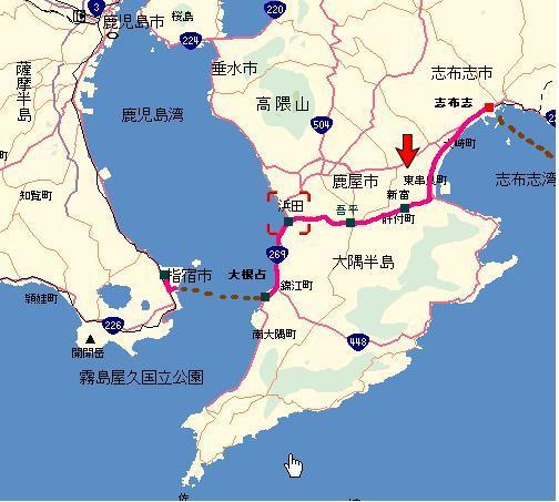 11:40 長い坂を登り切った峠から錦江湾が見えてきた。何故か、私、海が見えると、とにかく 嬉しい。ここからは、ほぼ一気に下り、浜田で湾沿いの国道R269に出て、そこからはひたすら 南下して大根占(おおねじめ)へ向かう。 12:50 右手には錦江湾が広がり、前方には対岸の開聞岳、振り返れば桜島という、正に これぞ薩摩という道路を快走し大根占漁港に到着。 直近の指宿行きのフェリーが14:30だということを確認して、町へ昼食を食べに戻る。 |