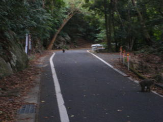 | (猿の群れが道を塞ぐ) | (林道を抜ける・看板には「みどりの回廊」) | |