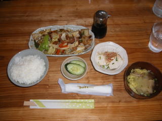 | (野菜炒め定食+アイスコーヒー:1060円) | (番屋峯キャンプ場に設営終了) | |