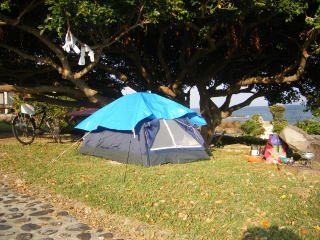 | 「はちまん」は島には珍しい都会的な美人母娘が切り盛りしており、野菜炒めも美味だった。 たっぷり1時間以上休んでから出発したのだが、その時点で、今晩は安房(あんぼう)港の少し 先にある「番屋峯キャンプ場」に泊まる事に決めた。それでもあと20q足らずだ。のんびりペース で行こう。 途中「千尋の滝」などの名所もあるが、どこにも寄らず、1時間半ほどで安房に到着し、番屋峯 キャンプ場にチェックイン?。 このキャンプ場は「屋久どん」というレストランに併設されていて、事前の調査でも(余り当てには できないのだが)とても環境が良さそうなところだった。期待は裏切られなかった。何せ今回初の キャンプなのだ。そのために重い荷物を横浜から運んできたのだと思えば、力が入るというものだ。 番屋峯キャンプ場ホームページ 3:40 設営完了。 テントが張り終わって真っ先にする事は、テント内にケースに入った蚊取り線香 をつるす事だ。 これは北海道での反省からの教訓。 その後、海を眺めつつ、コーヒー、紅茶を飲み、多少の疲れが伴うけだるいような寛ぎのひと時を過 ごす。かなり至福(言語矛盾?)の時かもしれない。 暗くなる前にパン3ケとスープの夕食をとり、7:00にはテントにもぐりこむ。 |