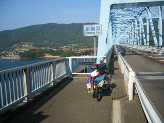 | 6:00 起床。 7:00 付近を散歩してから朝食をしっかり食べる。 出かけようとすると、洗濯をしてくれたおばちゃんが「甘いものは好きか」と聞くので「はい」と答えると 写真の「おはぎ」を包んでくれた。これは明日のおやつと昼食になる。おまけにペットボトル入り麦茶 を凍らせてくれたので、半日冷たいお茶を飲み続けられた。感激して感謝です。 今日はいよいよ、鹿児島県を離れ熊本県、天草に渡ることになる。 8:10 旅館発。 快調に飛ばし、30分程で長島へ渡る「黒之瀬戸大橋」が見えてきた。 ヒエー、長い! |