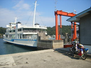 | 多分今まで渡った橋で一番長いかも知れない。橋脚も高い。しかも、私、橋とトンネルが苦手なの だ。意外と交通量があるので、車道は敬遠する事にしたのだが、歩道は幅がない。バランス感覚 の良い人なら漕ぎ渡れるかもしれないが、私には無理だ。仕方ない、押して渡る事にした。 歩いて渡ったおかげで、途中、ゆっくりと海峡風景を楽しむ事ができる。上から見下ろすと、右から 左へ(八代海から東シナ海へ)多摩川の中流くらいの速さで潮が流れ渦を巻いている。後で聞いた ところによると今日は大潮だそうだ。吹き抜ける風も快い。 渡り終わったところに工事関係者が整理をしていたが、その話しによるとチャリダーの半分は歩いて 渡るそうだし、これからもそれがお勧めだそうだ。自転車事故がかなり多いらしい。 ここからはアップダウンの連続で疲れる(けれど気持ちは良い)道を20q足らず進み、ド−ンと下った とたん、道が終わる。そこが天草島、牛深へ渡るフェリーが出る蔵之元港だった。 11:45 蔵之元港到着 次の便が13:00発なのを確認して、ゆっくり昼食をとる事にしたが、ちゃんとした食堂が付近に 無く、やむを得ず軽食屋でカレーライスを食べるが(別にまずかったわけではないが)「なにもここ まで来てカレーでもねえだろう」といささか不満ではあった。今回の旅は「美味しい魚を食べる事」 が楽しみのひとつになっているのだ。 |