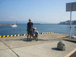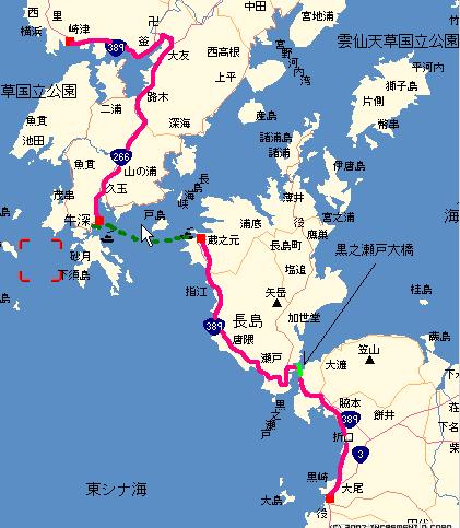 | 左右に島を見ながら30分かけてフェリーは天草島の牛深に着いた。ズーとデッキにいても全く飽き ない航海だった。 13:30 牛深港着 これで熊本県に入国だ。 まず、港の観光案内所に行き、観光地図を入手する。以後は、これをその都度丁度良い大きさに 折りたたみ、フロントバッグの上に置き、主にそれを頼りにコースを辿る事にしたが、これは我なが らうまい方法だと感心する。 町のスーパーでキャンプに備えて弁当等食料品を調達し、ついでにアイスを食べて今後の走りに 備える。 国道266号線を山の中、北へ向けて快走すること2時間弱で(20q足らずなのだが)、西へ向かう 国道389号線との分岐点、河浦に着く。R389に移り、ひと山越えると、数100mのトンネルをいく つか含んだ海岸沿いの走りやすい道が続くのだが、4時をすぎてもキャンプ適地がなかなか見つか らない。 いささか焦り始める。 |