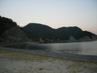 | 崎津のトンネル抜けたところで海側に逸れる旧道のような道が分かれているので、ひらめきで 曲がったのだが、これがビンゴ。 そこは小高浜海水浴場で、水洗トイレ、水場、に灯りまでがある理想の環境で、テント設営中に 散歩で通りかかった地元のおばあさんに仁義をきったところ、「ここは良い所で野営については 何の問題もない」と太鼓判を押してくれた。 (しかし海水浴場注意書には「キャンプ禁止」と書い てあった。) なんとか暗くなる前に設営を終え、毎度の事ながら、ゆったりしたキャンプ生活が始まり 19:00 テントに潜り込む。 |
