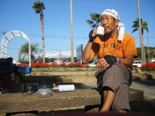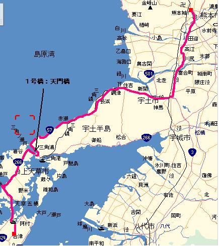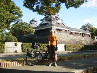 | 「橋が怖い」というのはどういう事かというと、多分、左側に逃げ場がない、という事ではないかと思う。 これはトンネルも同じなのだが、トンネルにはそこには壁がある。橋には空間しかなく、その下は海、川 なのだ。もちろん手すりはあるのだが、せいぜい腰骨高しかなく、なにかの勢いで寄りかかると落ちて しまいそうな感覚になる。高所恐怖症かもしれない。想像力の強い者ほど恐怖感が強いのだ。 8:25 第2号橋 大矢野橋を渡り切る。 ここでも勘違い、記憶違いをしていた。地図や情報をきちんと把握していない証拠だ。先入観として五橋 は一続きだと思っていた。また、第5号をそれと認識しないで渡ってしまったので、五とか四とかいう数に 自信がなくなり、第2号橋を渡った時にこれで終りだと思ったのだ。 ひとつの関門をクリアしたような気持ちで5qほど先の「天草四郎公園」でお茶などを沸かしてひと休 み。そこから更に10q程進み長い坂を登りつめると海が見える高台に出る。そこが「天門橋展望所」 だった。まだ橋があったのだ!しかも長い。結局710歩。 10:15 第1号橋 天門橋を渡り切る。 下りた所が「三角(みすみ)」の町だ。国道57号線沿いにオランダカフェという洒落た名前の休憩所が ありほっとした気持ちで、今渡ってきた天門橋を見ながらアイスコーヒーの休憩をとる。風が強い。 この辺りでは天草街道と呼ばれるR57は、海とコンクリート壁一枚隔てられただけの海岸線を走ってい る。強風、波の影響をもろに受けて、しばしば波しぶきの中を走る事になる。しかも風の抵抗に負けて 後のギヤを3又は4速に落すために、スピードは上がらない。 12:30頃 道の駅でのり巻き弁当 海岸線を離れ「宇土(うと)」の町を過ぎた辺りで九州の動脈、国道3号線に入る。 15:00 熊本城到着 熊本城は前のバス旅行の時に寄ったのだが、全く時間が少なかったので、是非もう一度行きたい ところだった。天守閣に登り、城域をゆっくり見て周り、西南戦争時の激戦を思い、夕闇迫る頃、出発 前に調べてきたビジネスホテルに予約の申し込み電話をすると、なんと、断られてしまった。そうなる と、走り回って探さなければならない。 例によって勘が働き、城からさほど遠からぬところにある「熊本ロイヤルホテル」に宿泊ができた。 しかも、支配人が一泊5900円のところを5000円にまけてくれた。理由は未だ謎だ。 また、また、例によって洗濯、入浴後食事のために繁華街に出る。アーケードの中にある「ふく泉」で 天丼定食を食べ、更に、アーケード内の「ヤマダ電機」に行く。 実はデジカメの電池が心許ないのだ。出発前に充電し、予備電池も充電して持ってきたのだが、 交換済みの方も、「残量少なし」表示が出ているのだ。恐らく画像サイズを大きく設定し過ぎたため だろう。そのために一昨日辺りからは、ここぞというところに限り、電源をONにするや、すぐさま シャッターを切り、又すぐ、OFFにする、というような事を繰り返しており、綱渡り操業が続いている。 何とか「充電器」がないものか、あわよくばそれで充電してもらえないだろうかという思惑で立ち寄 ったのだが、残念ながらなかった。もしあれば買っても良いと思ったが商品としても無い。 丁度隣にカメラと同じ「富士写真フィルム」の看板を出したデジカメプリント屋があったので、もしやと 思い、そこでも聞いてみたがダメだった。しかしその場で「屋久島灯台」での私の男らしい写真を 葉書サイズで数枚出力してもらい、ホテルに帰ってから親しい友人に絵葉書として書いて送った。 なお、サイクルメーターが完全にダウンしたので、本日からの走行距離は、地図上での 表示距離を積算したもので書き込みます。 |