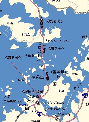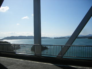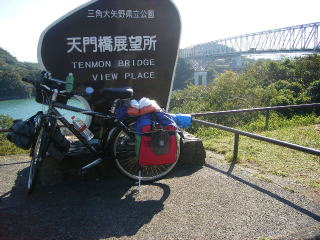 今日のメインイベントはなんと言っても「天草五 橋」だ。 もちろん観光名所でもあるのだが、自転車旅 行としては、短時間にこんなに多くの海の橋を 渡る機会などそうあるものではない。じっくりと 楽しむ事にする。 という訳でもないが、宿の主人の勧めもあり、 また恐怖感もあり、全て歩いて渡る事にした。 7:45 宿を出発 ところが出発して直ぐに一つの橋を走り抜けて しまった。実はこれは第5橋だった。記憶の中 の五橋は全て長く高かったので、第5橋は一番 短い(177.7m)こともあり街中の一般の橋か と思い、まさかそこがスタートとは思わなか った。 それで、意識して渡ったのは第4号からだ。そ れに第4号は一番長い。(510.0m)歩いて 渡ると言っても歩道は狭いし、台風の影響で 風は強いしで、ハンドルをしっかり掴んで、真 っ直足元と前をじーっと見据えなければならず、 景色を見ている余裕はない。これではつまらな いので、歩数を数えながら歩き200歩毎に立ち 止って、しっかり身体を固定し、海峡や周りの風 景を堪能し写真を撮ることにした。 第4号…730歩 第3号…500歩 第2号…360歩 だった。これによると一歩が70cmと小股だ。 本当に、そろそろ、恐々で歩いているのだ。 |