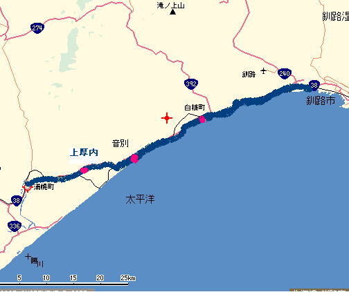 8:35 30q地点 音別を過ぎたところ。白糠(シラヌカ)まで14q