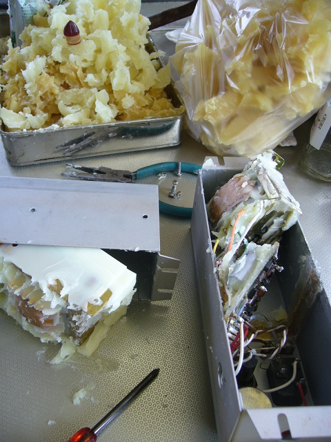 写真は、ダイオードとコンデンサーの交換後のもので、あとは蝋を充填して終わりです。