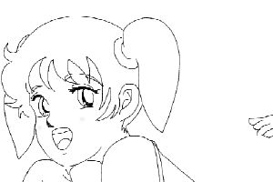 ここではフリーハンド<補間>でマウス描きをします タブレットやスキャン方式はしません ある程度の練習を積めば消す描くのくり返しで主線を完成できます このキャラクターのポージングは本来 片足伸ばしてもう片足は曲げるほうが絵になります (こういうポーズを選ぶのも可変則的で毛色が違うのが浜らしいトコです ) すっぱだかに見えますが描いている本人にとっては完成図への道程しか見えてません |