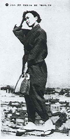 本文は、最初に皇居、靖国神社、共栄圏からの来訪者、東京の町並みの平穏さをアピールし、隣組、<厳しきこと鉄壁の如し、の防空陣>と題された、消防態勢の紹介をへて、この日本橋三越前で撮影された、1944年末?モード写真へと続くのである。