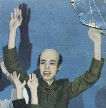 見ての通り、うら若き乙女が老若男女に扮して万歳している写真である。右上の人物を良く見ると…