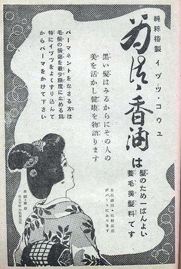 日本髪の女性、「黒い髪はみるからに」とあり、日本式の美を礼賛する広告だと思いきや…