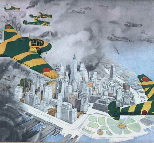 「大東亜戦争 海軍美術」(大日本海洋美術協会昭和18年9月)に収録された『紐育制圧の図』(古城 江観)である。