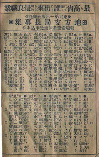 答)(略)支局長加入願と支局長事務執行説明書・報告紙其他の費用として装包送料共僅か金壱円也御送り下さい。(略)本社は到着と同時に冊子支局長嘱託證・事務執行説明書其他必要のもの一切をお送りいたします。貴下はその執行説明書によりてその日からでも事務をとって下さい。第一回の報告参り次第報酬金支局長箋(之は無代進呈のもの)を支給いたします。