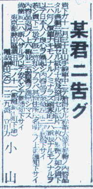 この考え方で行きますと、小山さんの出した新聞広告は、「私は国家的重要書類一式を、11月30日に山手線で紛失しました」、と全国に広言したようなものです。書類返戻の謝礼が500円ならば、アメリカのスパイは千円出して某君から買い取ってしまえ、と行動するやもしれません。逆に重要書類を回収すべく官憲が10人100人と出動するかもしれません。